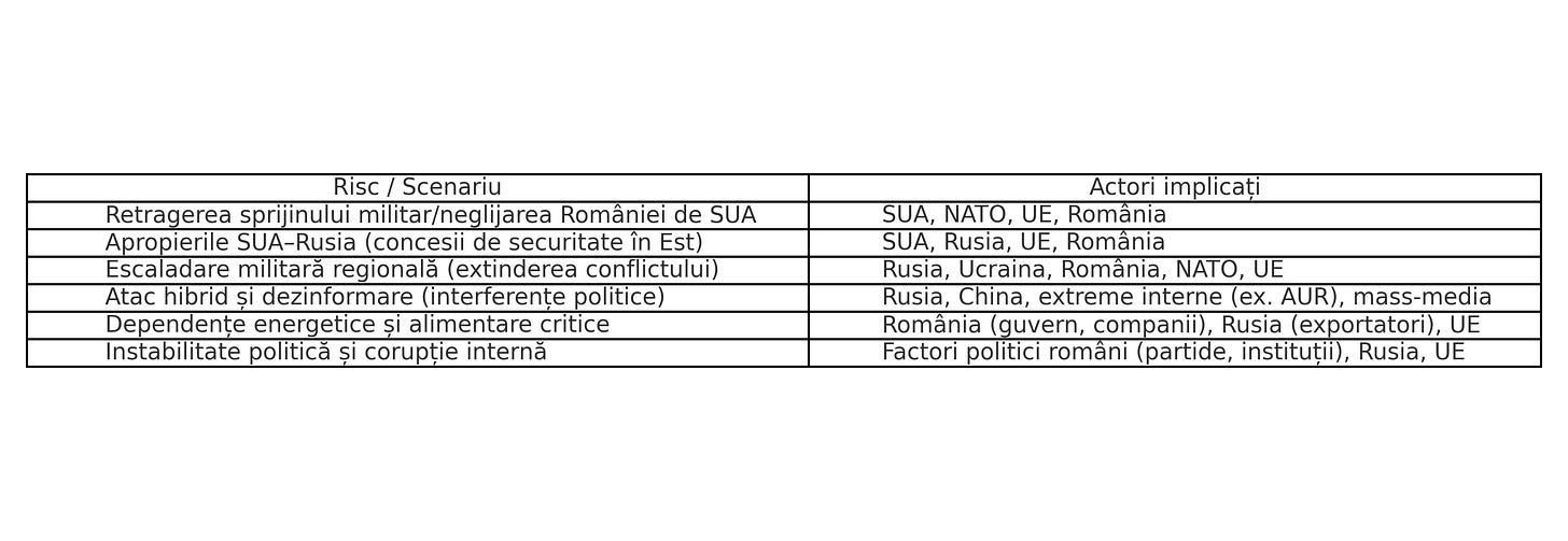 Analiștii avertizează că evoluția relației SUA – Rusia poate afecta securitatea României. Oficialii de la București (premierul Marcel Ciolacu, consilierul Iulian Chifu) insistă că parteneriatul strategic cu SUA rămâne solid și că nu există riscul retragerii trupelor americane din ţară . Cu toate acestea, expertul Corneliu Bjola (Universitatea Oxford) identifică două scenarii îngrijorătoare pentru securitatea europeană şi românească. Primul ar presupune concentrarea SUA pe competiția cu China şi retragerea sprijinului militar din Ucraina, forțând Europa să preia povara apărării comune . Al doilea scenariu implică o apropiere strategică SUA–Rusia: Washingtonul ar putea oferi concesii Moscovei (ex. recunoaşterea unor sfere de influență în Est), ceea ce ar lăsa România vulnerabilă . În acest context, Cristina Diaconescu (consilier CSAT) a avertizat că România ar putea fi inclusă într-o nouă „împărțire a sferei de influență” fără să aibă un cuvânt de spus . Riscul ca Washingtonul să își regândească prioritățile strategice la un nivel care să afecteze România nu poate fi neglijat, mai ales într-o perioadă de incertitudine globală.
